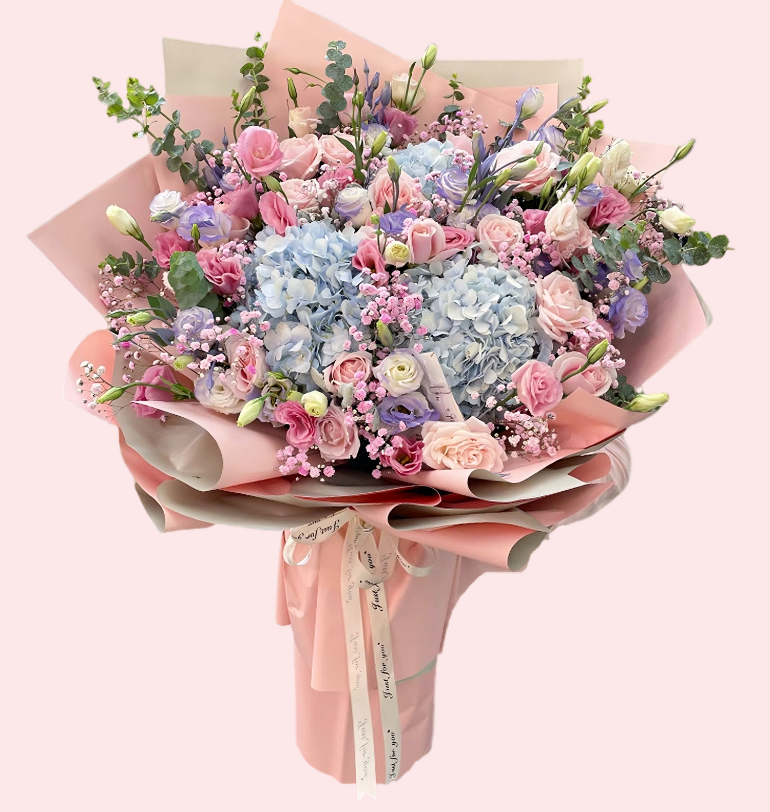 Bouquet of pink roses, hydrangeas with lisianthus, and pink and purple daisies
