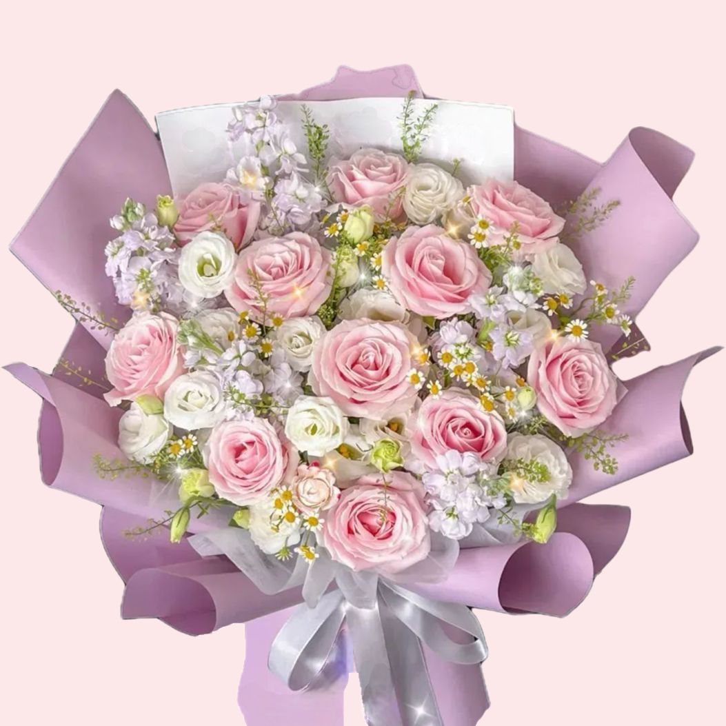 This bouquet features 11 pink roses, symbolizing "unwavering love for you." Paired with violets, white lisianthus, and chamomile, the soft colors and refreshing fragrance create a bouquet that evokes the gentle warmth of lovers in the morning light, a blend of romance and elegance. Understated and elegant, this bouquet is perfect for a gentle, intellectual woman.