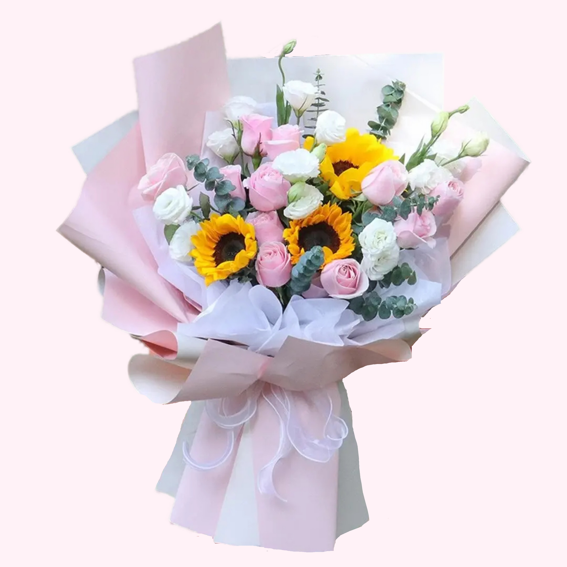 向日葵粉玫瑰配白桔梗尤加利葉花束