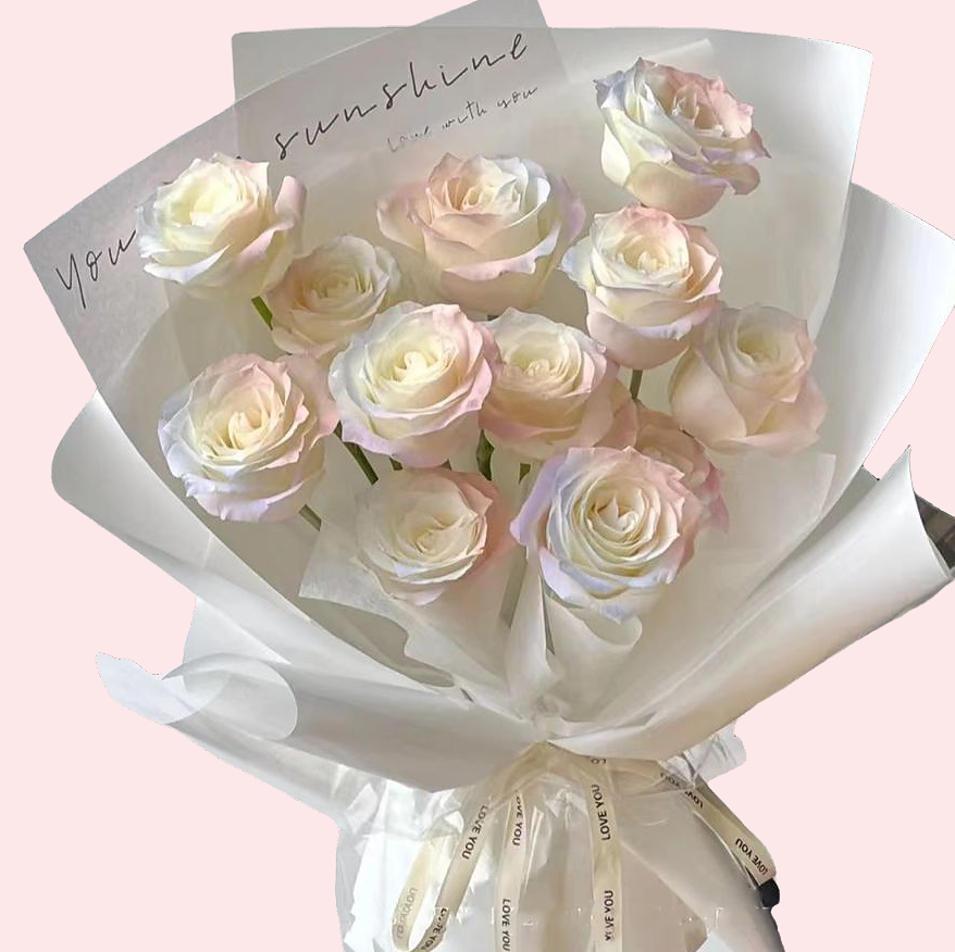 這款花束以11朵粉彩玫瑰為主角,色澤淡雅夢幻,融合了淡粉、奶白與微藍色調,宛如晨曦中的柔光,清新又高級。整體極具現代簡約風格。