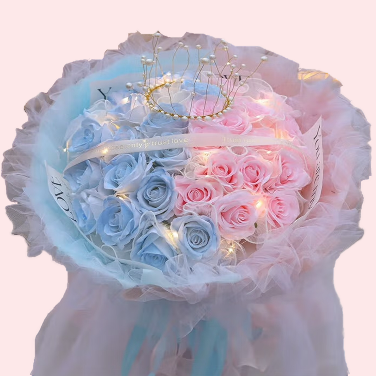 這款花束由 33枝玫瑰 組成,以 粉紅 + 淡藍玫瑰 浪漫交錯,象徵「夢想與愛」的交融。彷彿童話中的公主之花,滿滿儀式感。