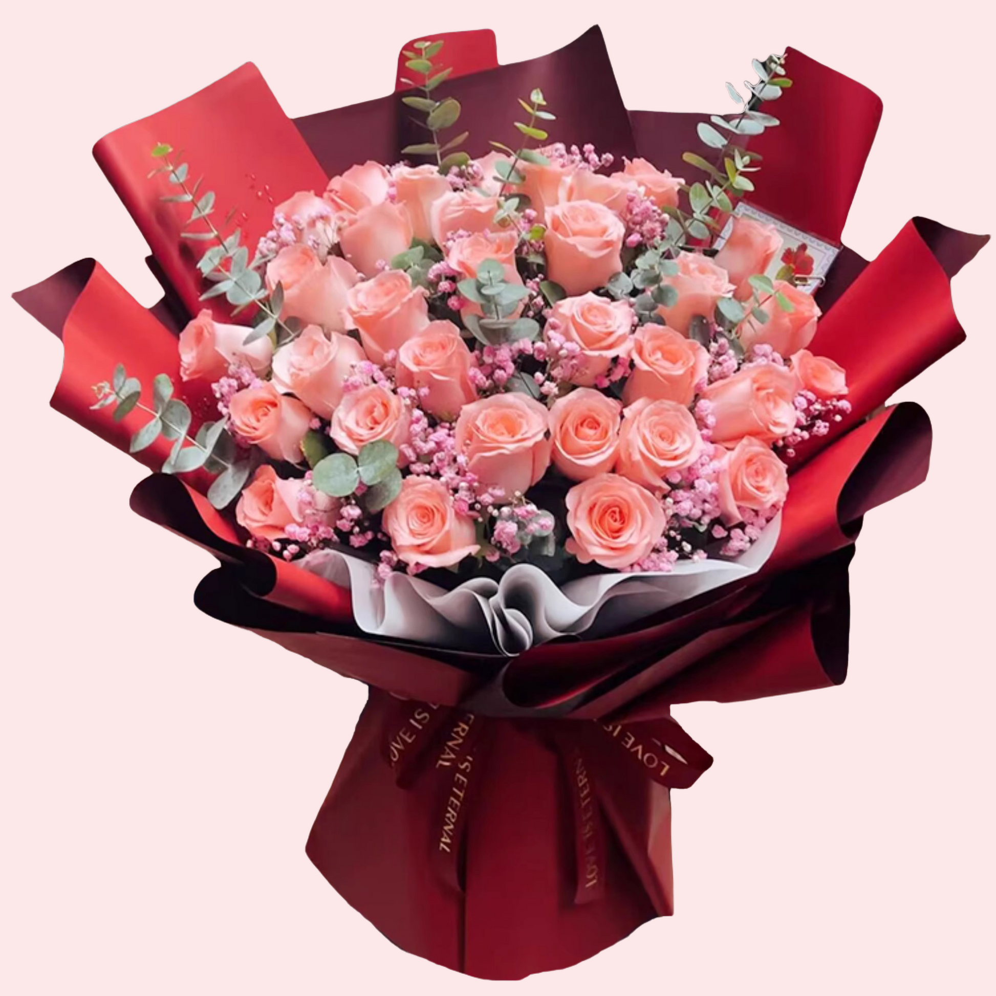 這款花束精心挑選 33 枝粉紅玫瑰 搭配 滿天星點綴,彷彿將戀愛中的悸動與純粹愛意化為實體。粉玫瑰象徵浪漫與珍惜,滿天星則如夜空中閃耀的守護星,訴說著不變的承諾與陪伴。