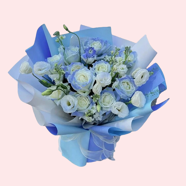這款花束以獨特迷人的 碎冰藍玫瑰 為視覺焦點, 感覺神秘、深情、夢幻愛意,搭配 白色桔梗 的純淨與 紫羅蘭 的高貴冷艷,層次豐富、色調柔和,是一款不流俗的浪漫花束。