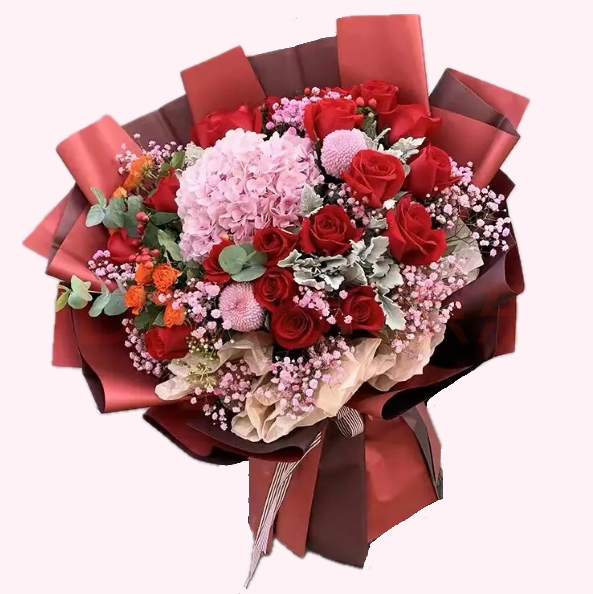 紅玫瑰,粉繡球花配粉色滿天星,乒乓菊,迷你多頭橙色玫瑰、尤加利葉花束